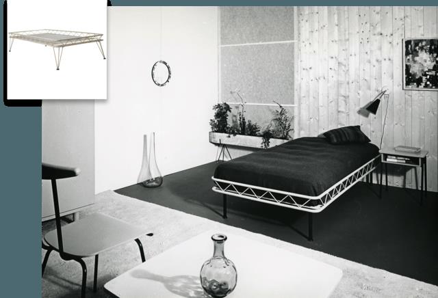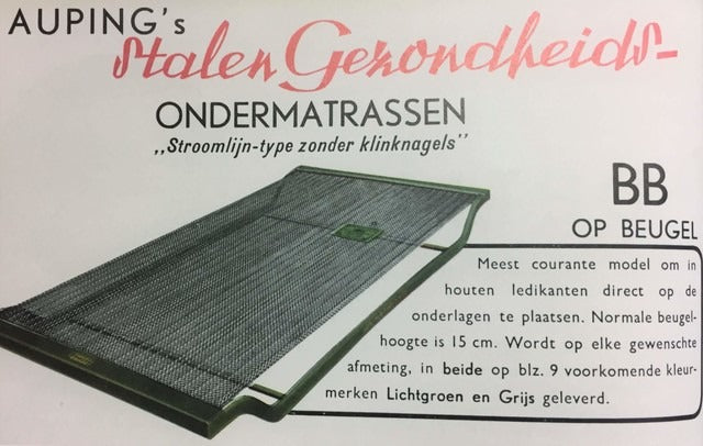 On behalf of the Amsterdam Burgerziekenhuis, Johannes Auping improves the first bed that he had designed for the St Geertruiden Gasthuis in Deventer: Hospital bed No. 17. It consists of removable wooden plates and steel. Both the wooden and steel parts can be delivered in different colors. It is the first bed with an Auping mesh base
