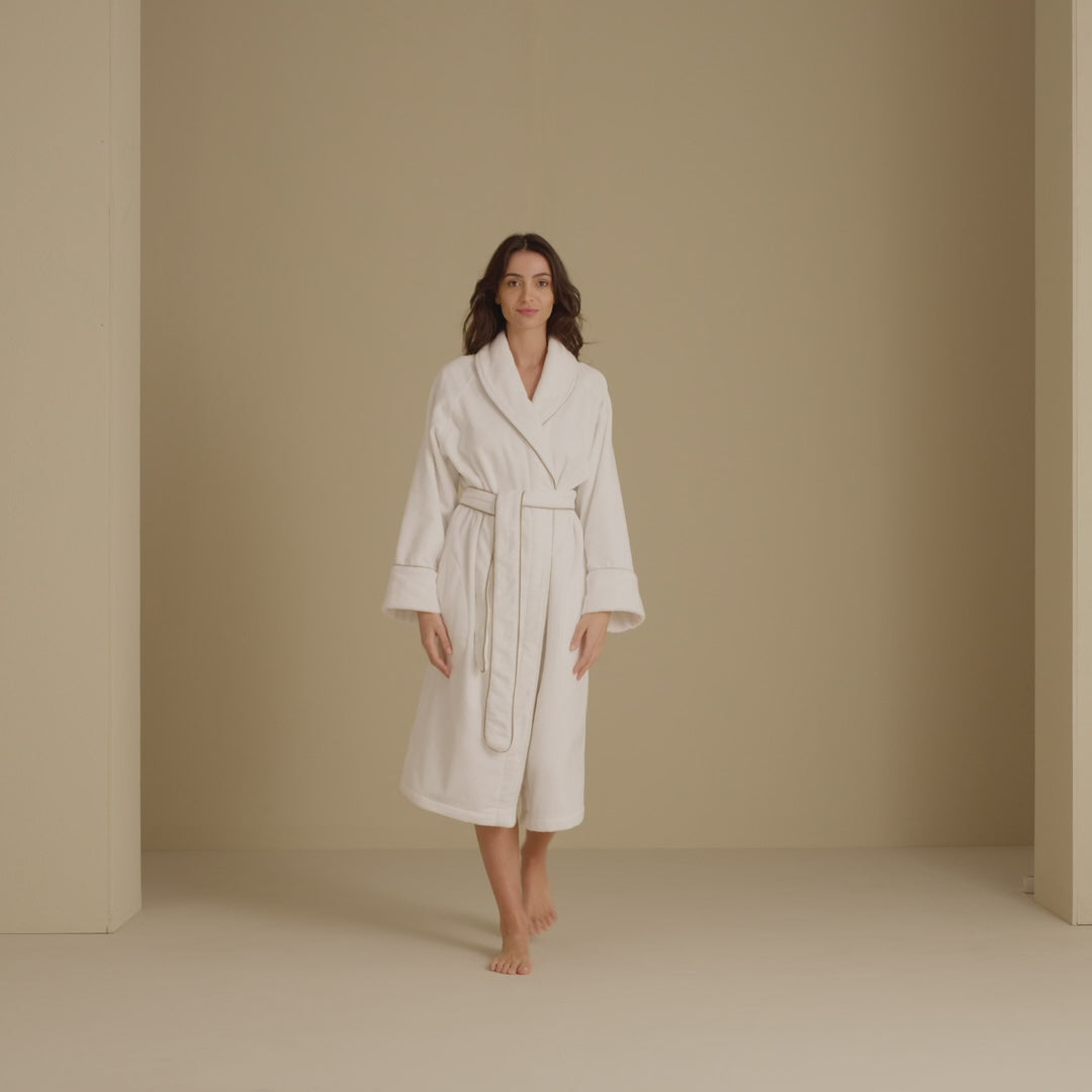 The Continental Bathrobe, crafted from pure fluffy cotton with contrasting piping, offers unmatched comfort and elegance. This sumptuous velour robe features a shawl collar for added warmth, wide cuffs, and a matching belt. Perfect for luxurious relaxation, it elevates any bathroom experience with its plush feel and refined design.