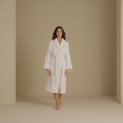 This luxurious Continental Bathrobe is crafted from pure fluffy cotton with a fine border of contrasting piping.